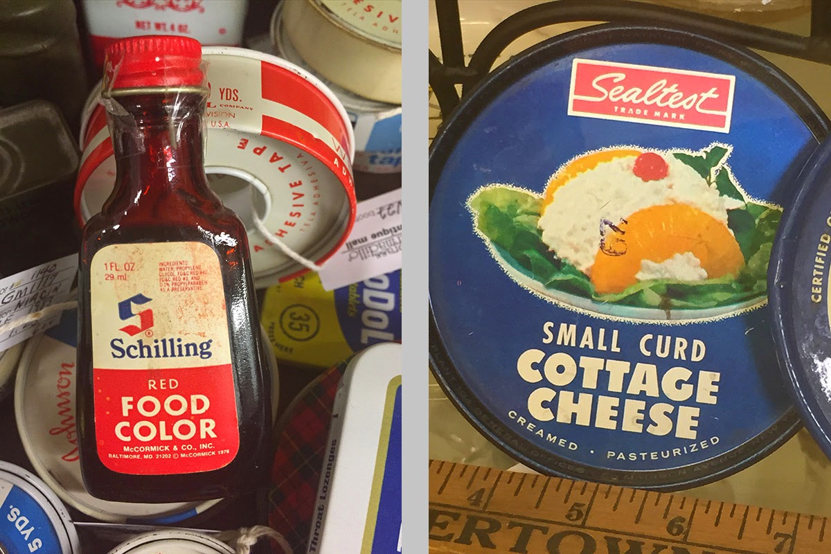 Part of me gets the cottage cheese lid. I think it’s an old brand that doesn’t exist anymore. But the food coloring?? That’s the kind you still find in stores. Also, notice the lid has been taped on. So it’s not only used, but faulty and jury-rigged.