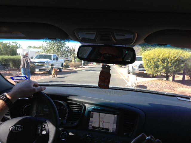 In the end, instead of “camp grounds”, I classified the place as a “retirement home”. Every single person there was over 60 (and we saw quite a few people). They’d just kind of mosey around, sometimes walking their dogs right in the middle of the road. One guy had his dog on a leash that stretched all the way across the street. As we drove up, it looked like we were crossing the finish line at a marathon. The guy didn’t seem to want to rein in his dog, though, and even gave us a dirty look as we passed. I’ve posted a picture for your enjoyment: