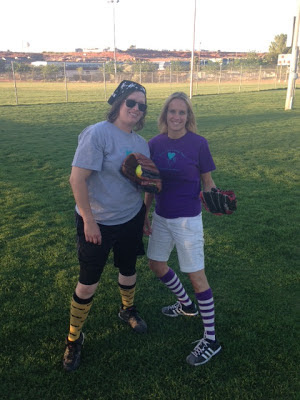 3. Cory and her fiancé are amazing. Her fiancé is fast and caught a couple pop flies. Cory had some amazing catches at first base. On one play, the short stop – a guy who’s played for years – hurled the ball at her face. Without flinching she caught it and got the guy out. I would have screamed and ducked, then chased the ball into our dugout. Again, no lesbian stereotypes.