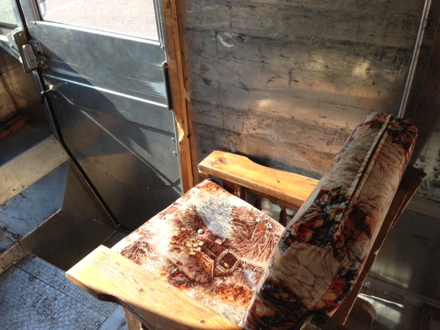 As you can see, it’s like a gigantic version of those old milk trucks. The key broke in the ignition and they can’t get it out. So, when you get into the truck, you just turn what looks like an empty ignition switch and the thing starts. Also, it didn’t come with a passenger seat, so they plopped in an old lady’s chair: