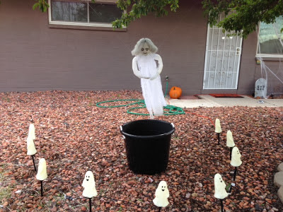 Windy and Chris have a row of ghost lights they bought last year. They had planned on lining the sidewalk with them, but they block the cemetery. So we discussed ideas and decided to make them ‘worshipping’ ghosts. We put them in a semi-circle around a cauldron and they look like druids. Well, happy druids because the ghosts are very smiley.