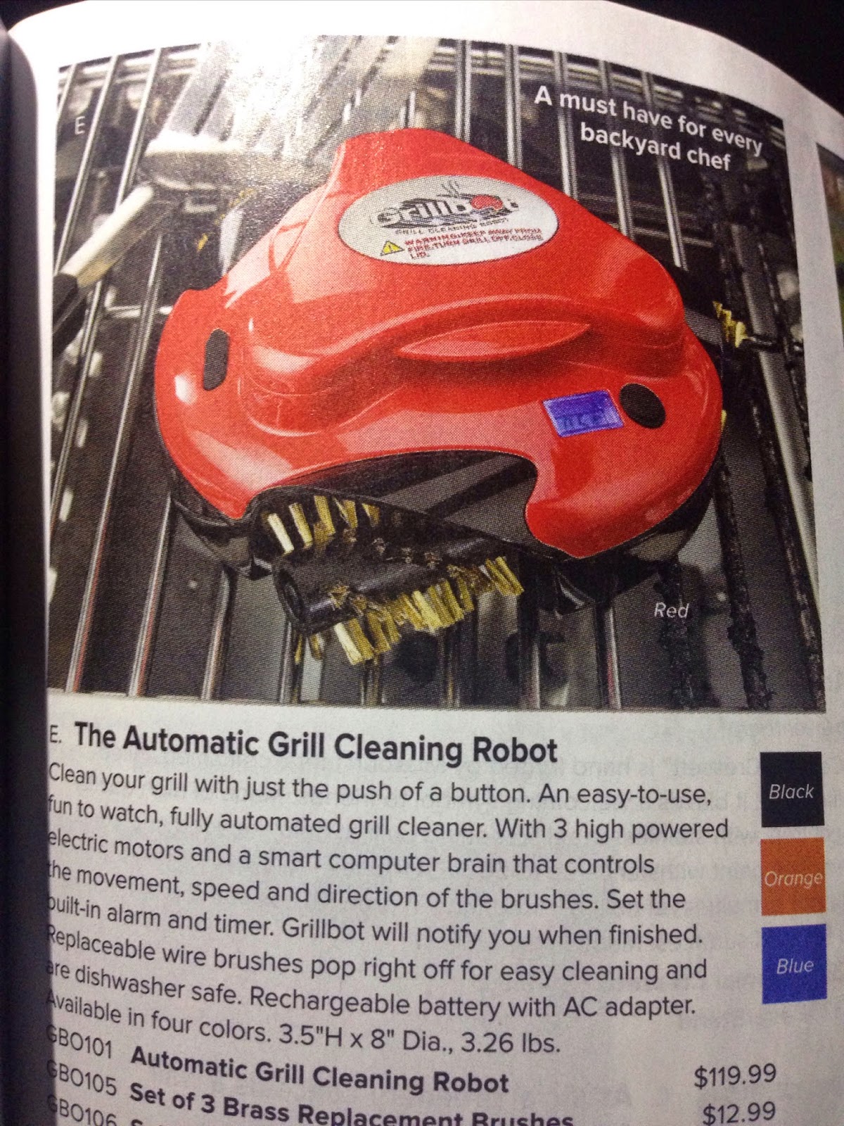 I can just picture the grill Roomba now, zipping up and back once, then stopping. The owner would wipe a hand across his forehead and say, “Whew, you sure saved me a lot of work.” Then he’d look at the camera and say, “Thanks, Grill Roomba!”